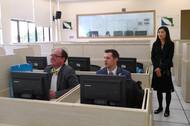 会后,周颖刚教授带领乔治·梅森大学来访团参观了经济楼,耿森助理教授为来宾介绍了实验经济学实验室及教研成果。