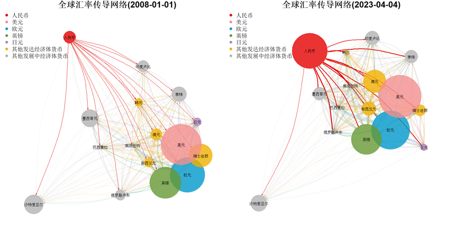 全球汇率传导网络。相比2008年人民币尚处于全球汇率传导网络边缘位置,2023年初开始,人民币在全球汇率传导网络中逐渐进入全球货币体系的中间位置