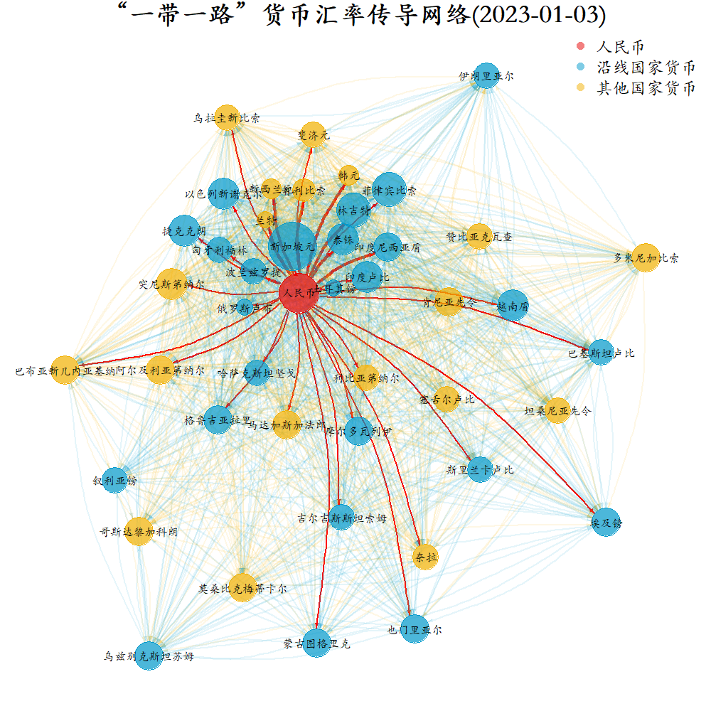 上图展示了2023年1月3日“一带一路”区域45个相关国家货币的汇率影响网络,红色圆点为人民币、蓝色圆点为沿线国家、黄色圆点为“一带一路”其他国家。结果显示,人民币与沿线国家货币关系更为紧密,沿线货币间关系也更为紧密