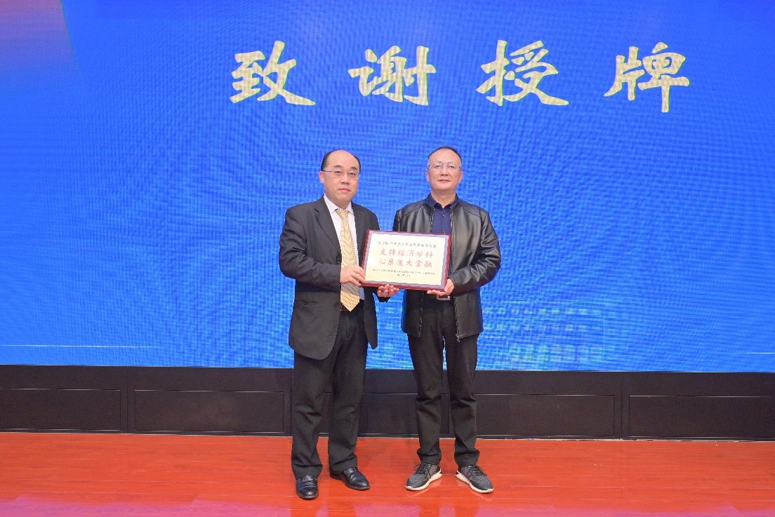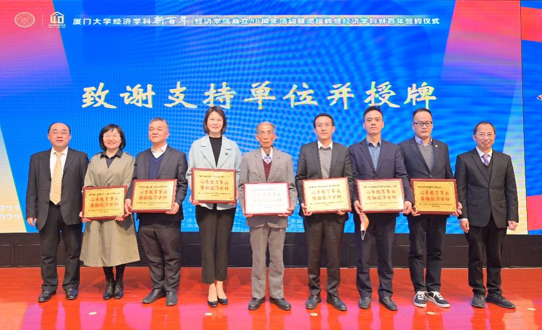 在参会人员的共同见证下,闽都陈嘉庚公益基金会副秘书长张莹,中国建设银行股份有限公司厦门市分行副行长林瑜,兴业银行股份有限公司厦门分行副行长黄春强,厦门市思明区产业投资有限公司总经理卢宁,厦门福隆置业集团有限公司执行董事黄华钧,中泰证券股份有限公福建分公司财务总监许永定,晋江杨杨商贸有限公司总经理杨海潮作为嘉宾代表上台接受授牌,黄鸿德向各嘉宾代表授予印有“心系教育事业、情融经济学科”字样牌匾。
