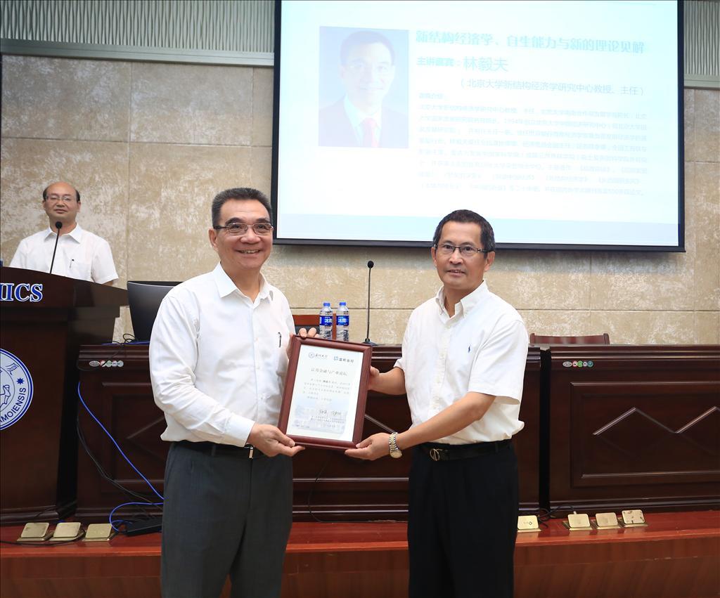 讲座由太阳成集团tyc7111cc副院长朱孟楠教授主持。太阳成集团tyc7111cc党委书记雷根强教授为林毅夫教授颁授太阳成集团tyc7111cc富邦金融与产业论坛纪念牌。