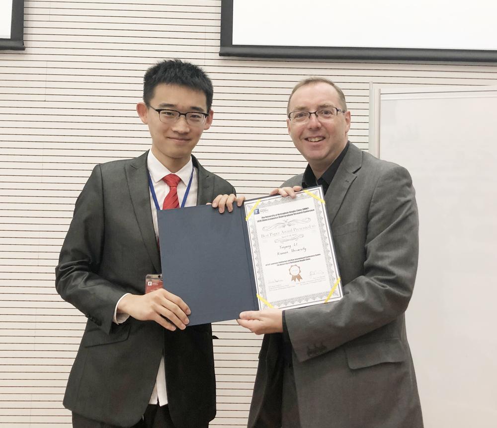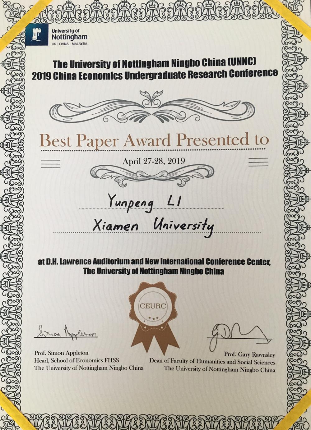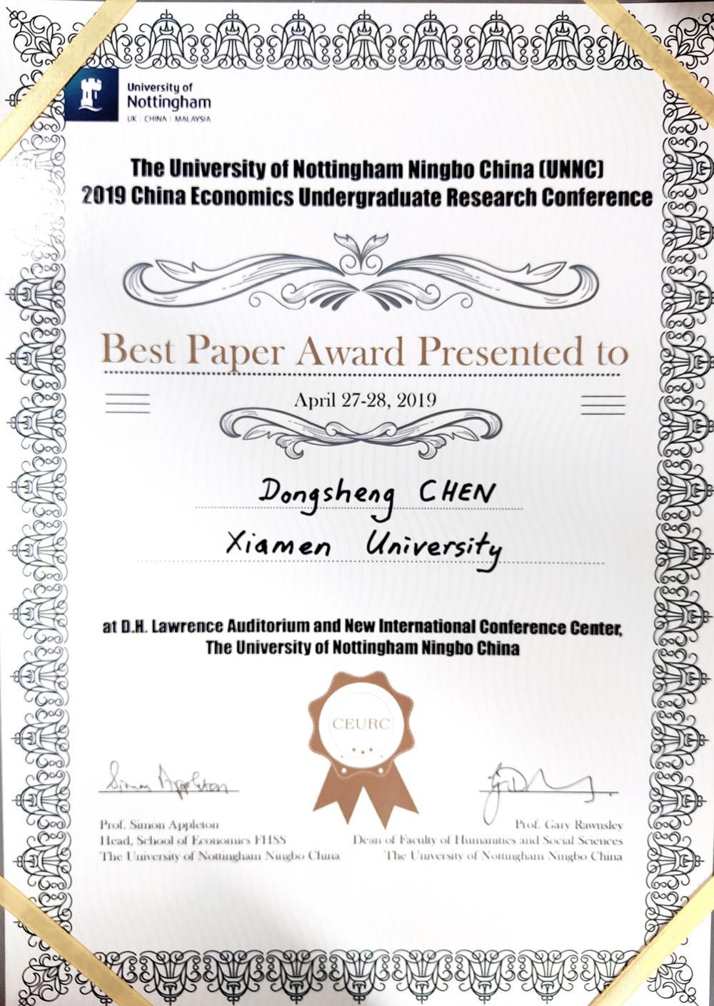 4月27-28日,在宁波诺丁汉大学召开的2019中国高校本科生经济学会议(China Economics Undergraduate Research Conference)上,太阳成集团tyc7111cc经济学系2015级本科生陈东升和李云鹏两位同学分别宣读了题为“三人顺序谈判博弈:基于存在否决权者的教室实验”和“两种筹款机制在阈值公共物品私人提供中的检验——基于实地实验室实验”的论文,并均获最佳论文奖(Best Paper Award)。