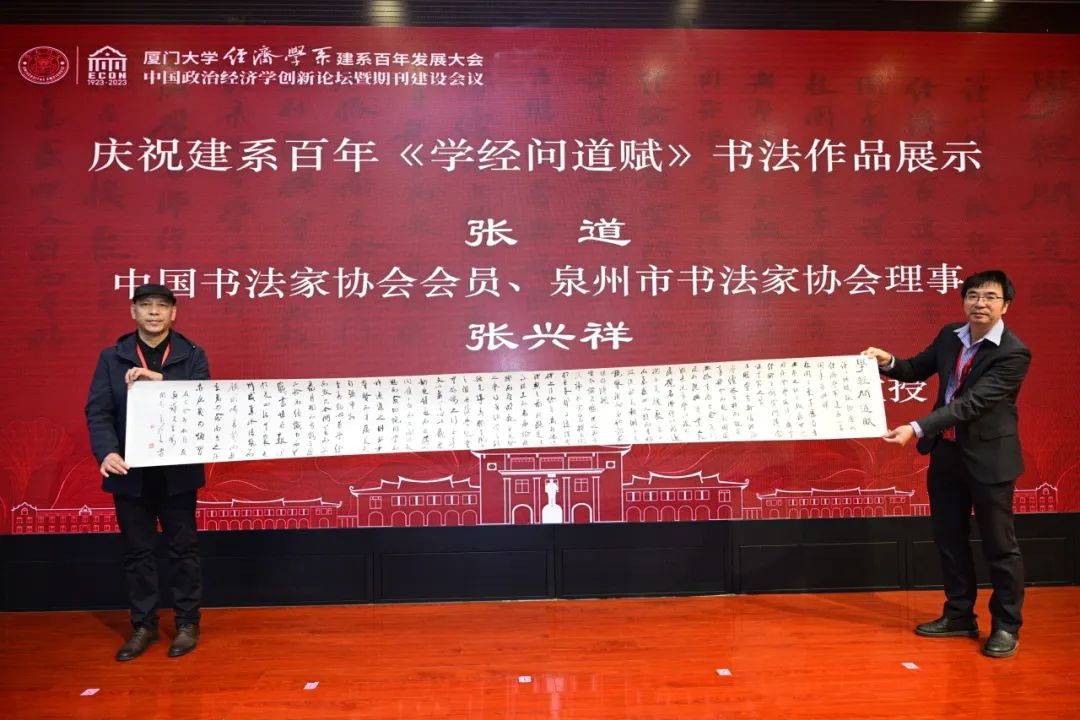 大会最后,张兴祥教授、中国书法家协会会员张道为嘉宾展示庆祝建系百年《学经问道赋》书法作品,表达厦大经济学人“兴邦之计不辍,济世之用弥坚”的信念与决心。