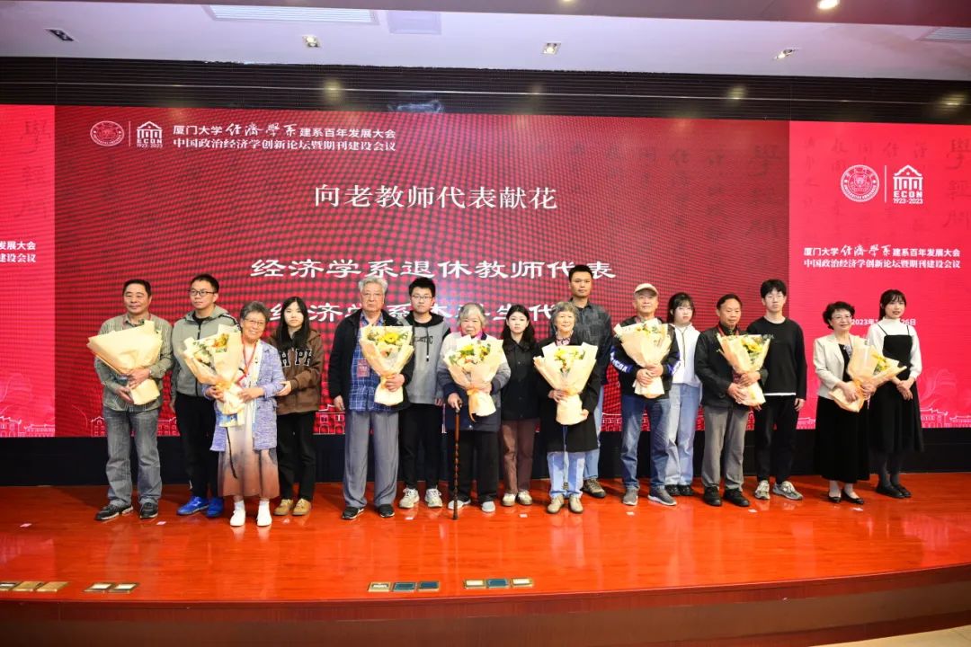 厦大经济学系如今取得的成绩,离不开一代代经济学人的默默耕耘。大会上,经济学系的优秀学子代表,为经济学系退休老教师代表献上鲜花,感谢他们长期以来为经济学系的繁荣发展,把自己的一生贡献给祖国的高等教育事业所作出的努力,同时送上最美好的祝福。