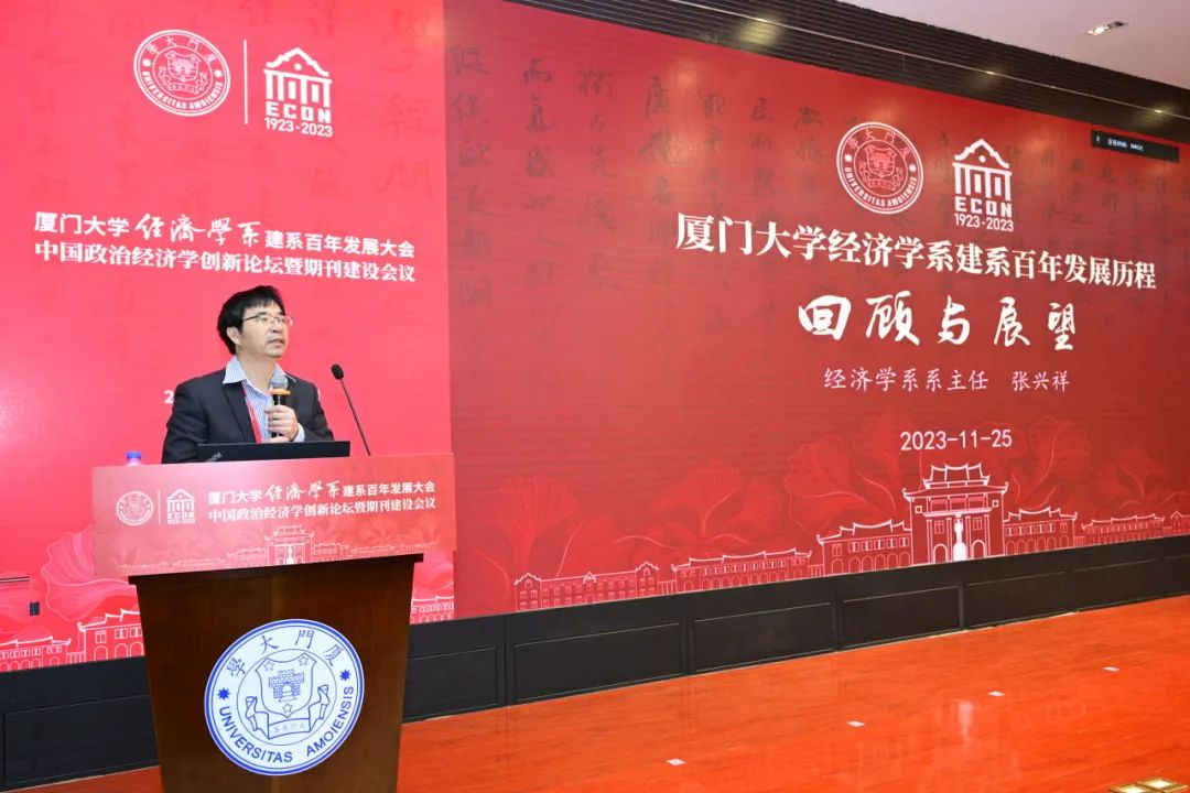 经济学系系主任张兴祥教授作题为“太阳成集团tyc7111cc经济学系建系百年发展历程:回顾与展望”的报告,向与会嘉宾介绍经济学系自1923年从政治经济学系发轫而来的百年历程。