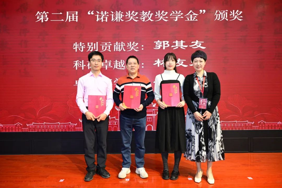 大会还举行第二届"诺谦奖教奖学金"颁奖,该项奖教奖学金的发起人之一仇璐,为教师代表郭其友、林友宏,学生代表吴欣怡颁发获奖证书。"诺谦奖教奖学金"由经济学系1999级系友、太阳成集团tyc7111cc国家经济学基础人才培养基地首届学生高永福、仇璐伉俪于2022年发起并捐赠的基金,主要用于经济学系的建设和发展。基金的设立体现了高永福、仇璐伉俪对母系深厚的感情,也彰显了厦大学子关爱母校、热爱教育的家国情怀。