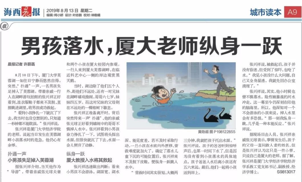 春风化雨,甘为人梯铸魂育人。张兴祥教授坚持担任《学经济》指导老师10余年,打造经济学科本科生科研训练基地,锤炼学生至诚报国的理想信念和严谨求实的科研作风;带领学生深入田野,在实践中学真知、悟真谛;面对失足跌入学校芙蓉湖的落水儿童,张兴祥教授毫不犹豫跳入湖中,救起落水儿童,用实际行动诠释立德树人榜样力量。