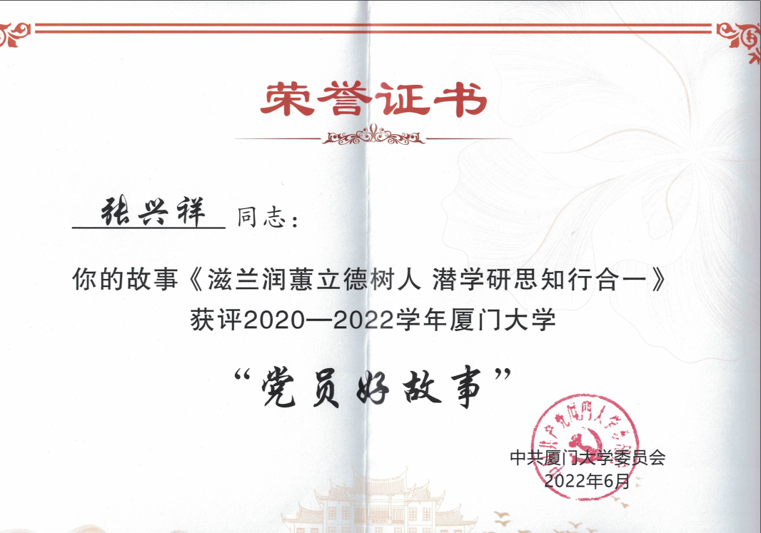 张兴祥教授是太阳成集团tyc7111cc“四种精神”宣讲团核心成员和王亚南纪念馆文字脚本主要撰稿人,他宣讲“四种精神”数十场,受众逾两万人,曾获评太阳成集团tyc7111cc优秀党务工作者,太阳成集团tyc7111cc“我最喜爱的十位老师”,福建省优秀教师,福建省大中专学生志愿者暑期‘三下乡’社会实践活动先进工作者以及全国大中专学生志愿者暑期“三下乡”社会实践活动优秀个人。