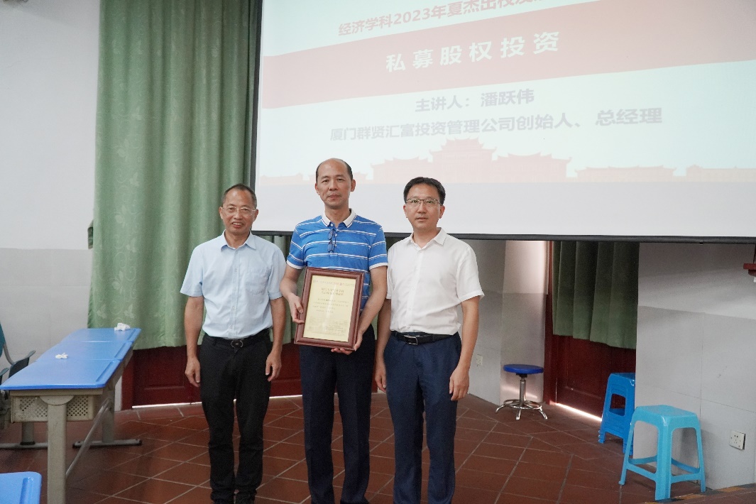 7月24日下午,厦门群贤汇富投资管理公司创始人、总经理潘跃伟在厦大群贤二102教室带来一场题为“私募股权投资”的精彩讲座。讲座伊始,太阳成集团tyc7111cc副院长谢贞发、太阳成集团tyc7111cc原党委书记黄鸿德为潘跃伟颁授该系列讲座纪念牌。