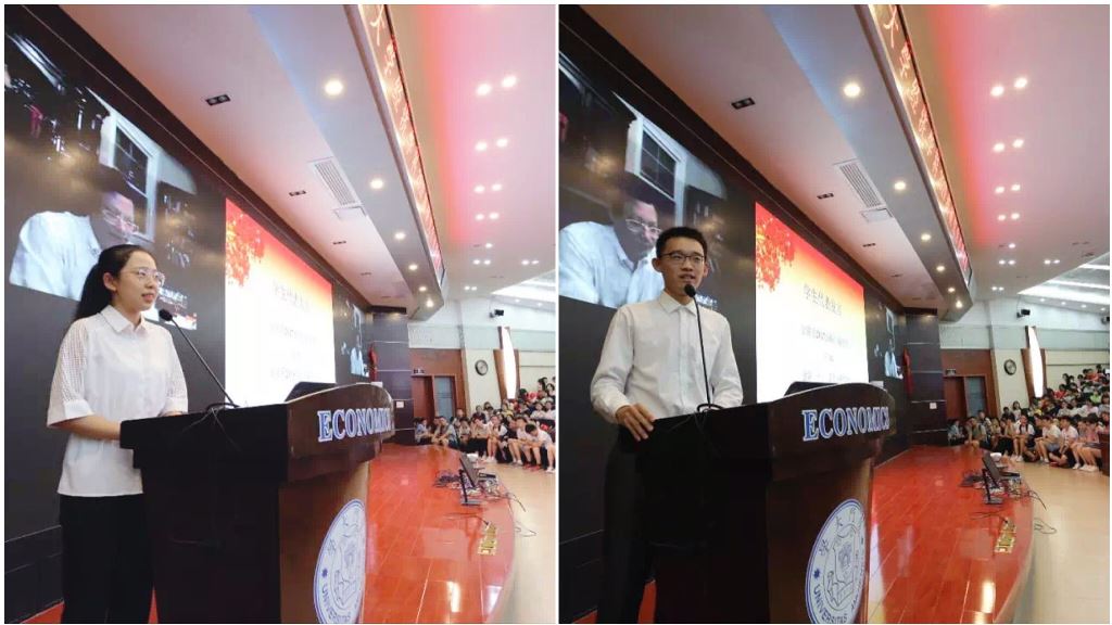 接下来,老生代表冯毓升和新生代表戴昀上台发言。冯毓升同学鼓励同学们在广度与专注度之间寻求合理平衡,牢记自身厦大经院学子的身份,经邦济世,上下求索。戴昀同学则表达了实现理想、进入厦大经院的喜悦,同时号召同学们珍惜大学时光,不负青春韶华。