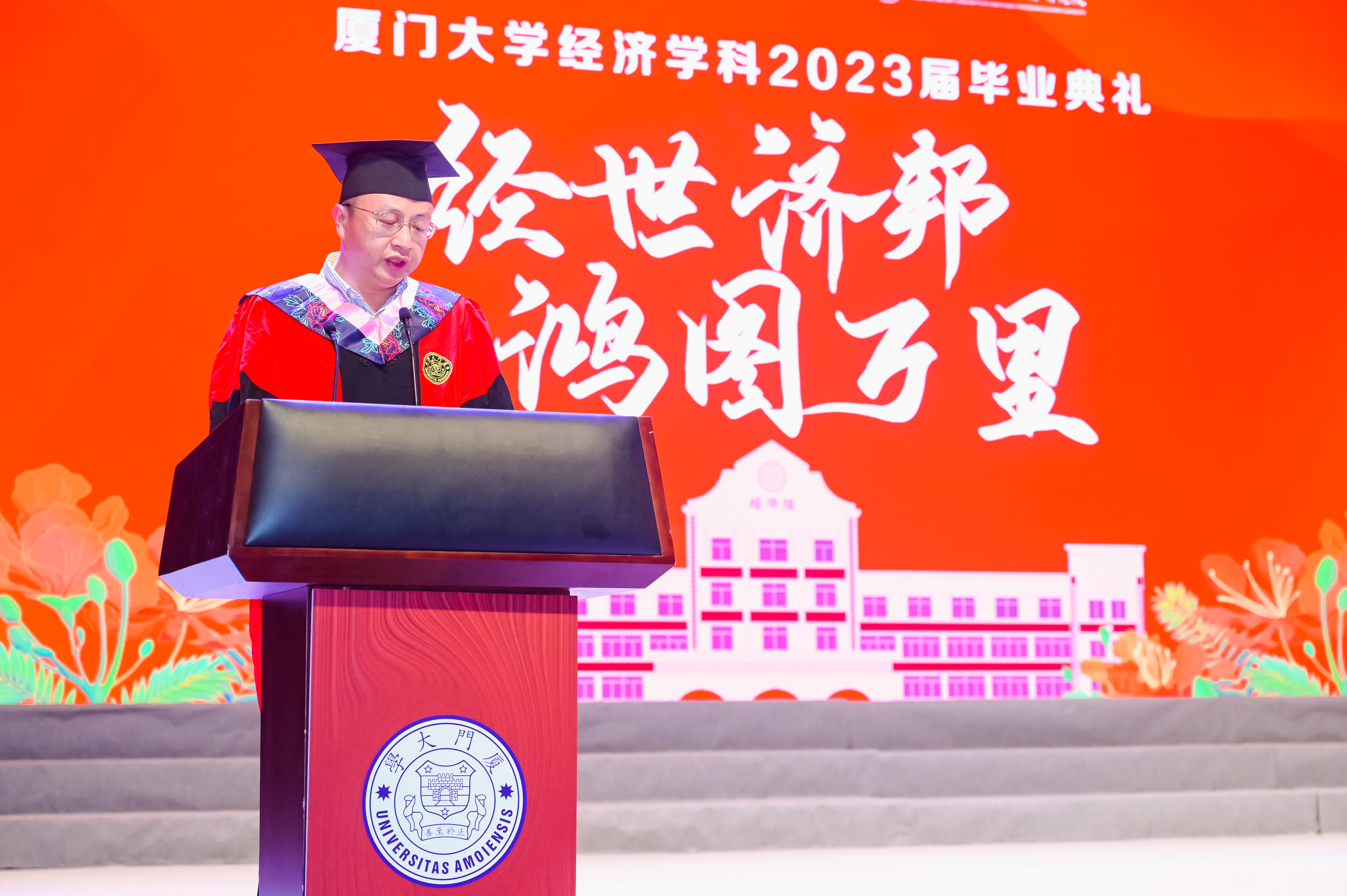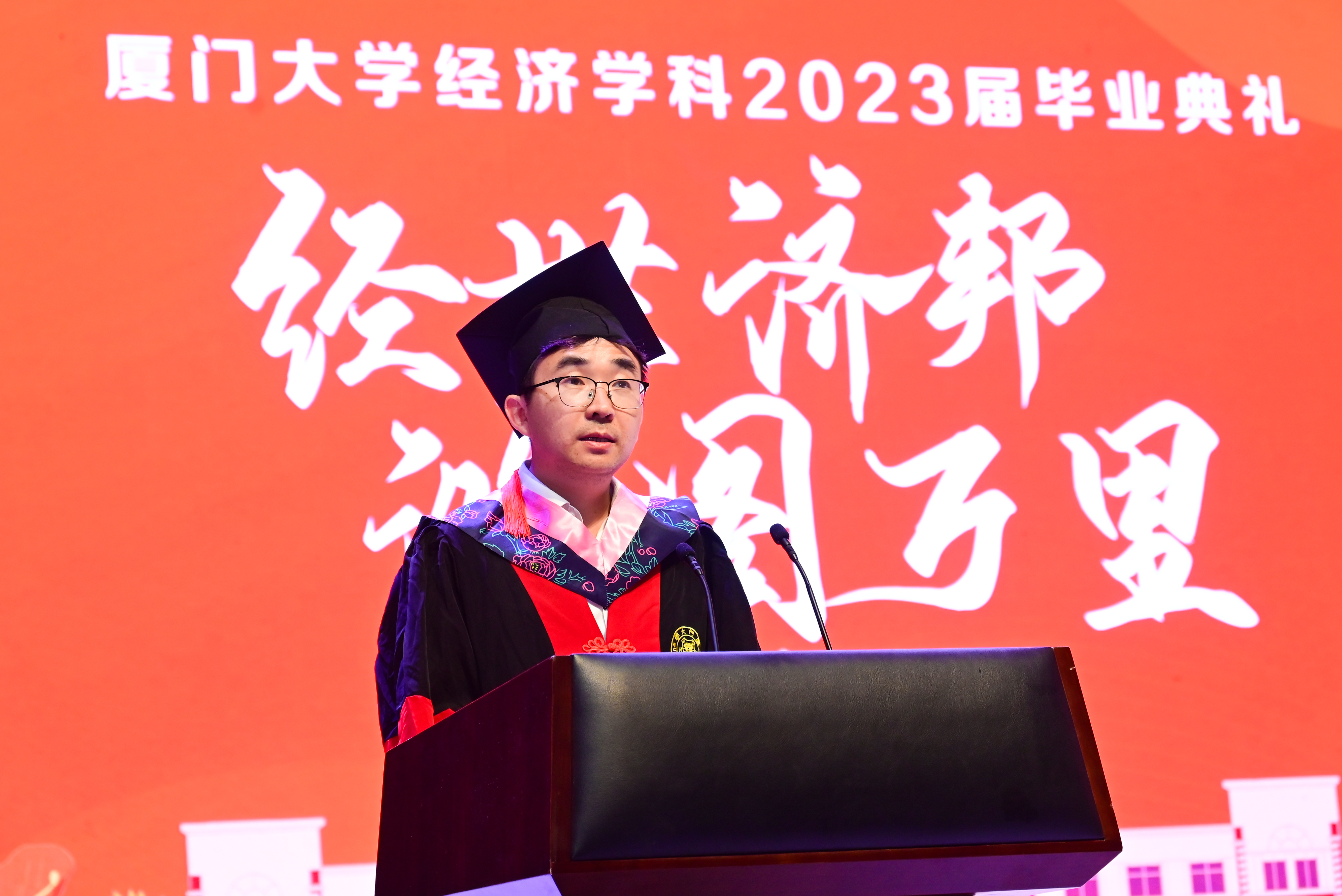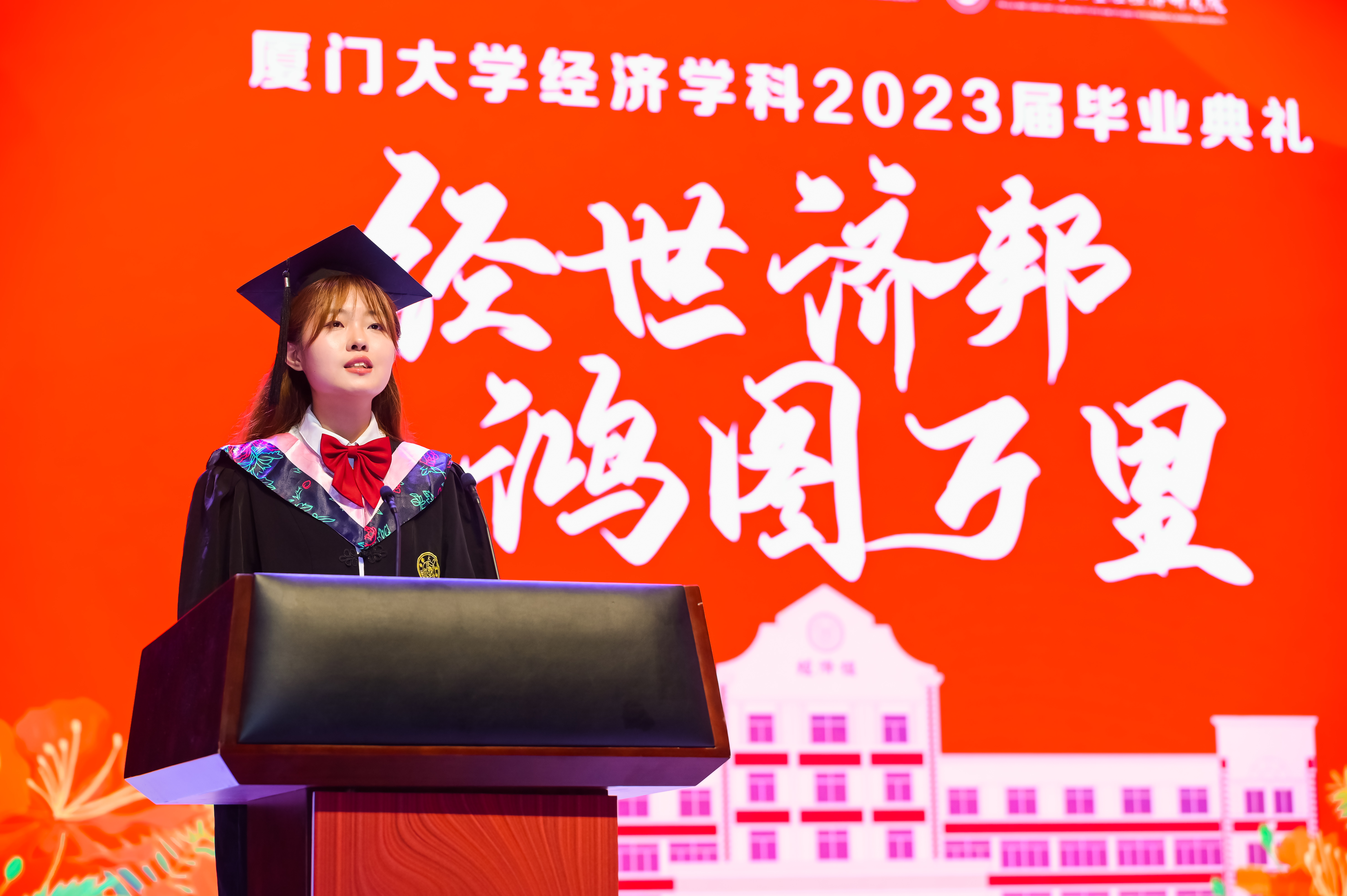 2023届本科生贺博钰、硕士生余一飞作为毕业生代表依次进行发言。他们回顾了自己的厦园时光以及在这几年里的成长和收获,表达了对学院领导、老师们无私奉献的敬意以及对学院、学校辛勤栽培的感谢,并提出了对未来的美好展望。他们动情地表示:“我们要主动承担起国家、民族和社会赋予的责任和使命,将梦想写进山河大海、写进蓝天草原,写在中华民族的这片土地上”“我们要肩负传递红色精神的使命,与时俱进,与党同心同行,为全面建设社会主义现代化国家、实现中华民族伟大复兴的中国梦作出新的更大贡献!”