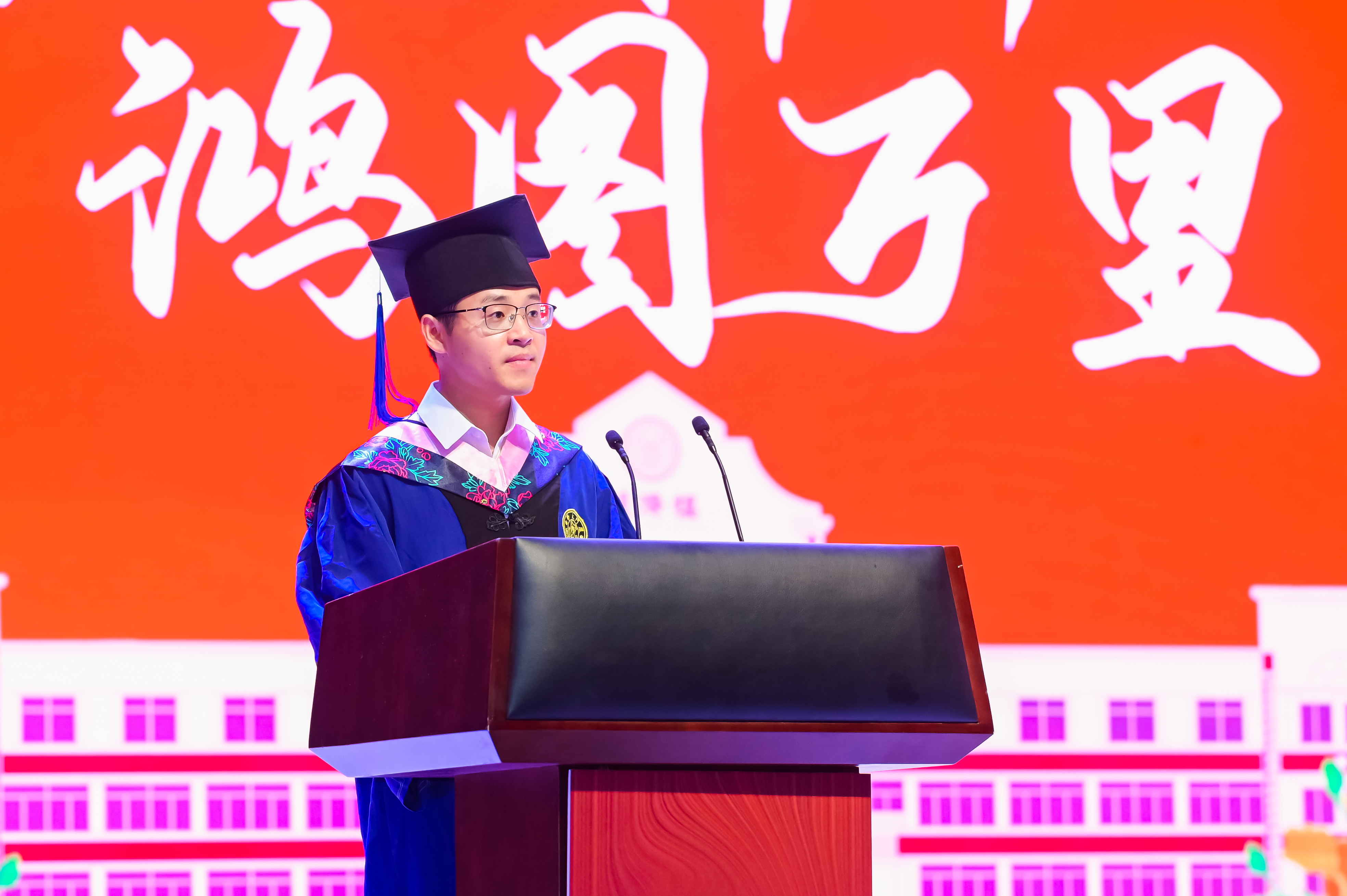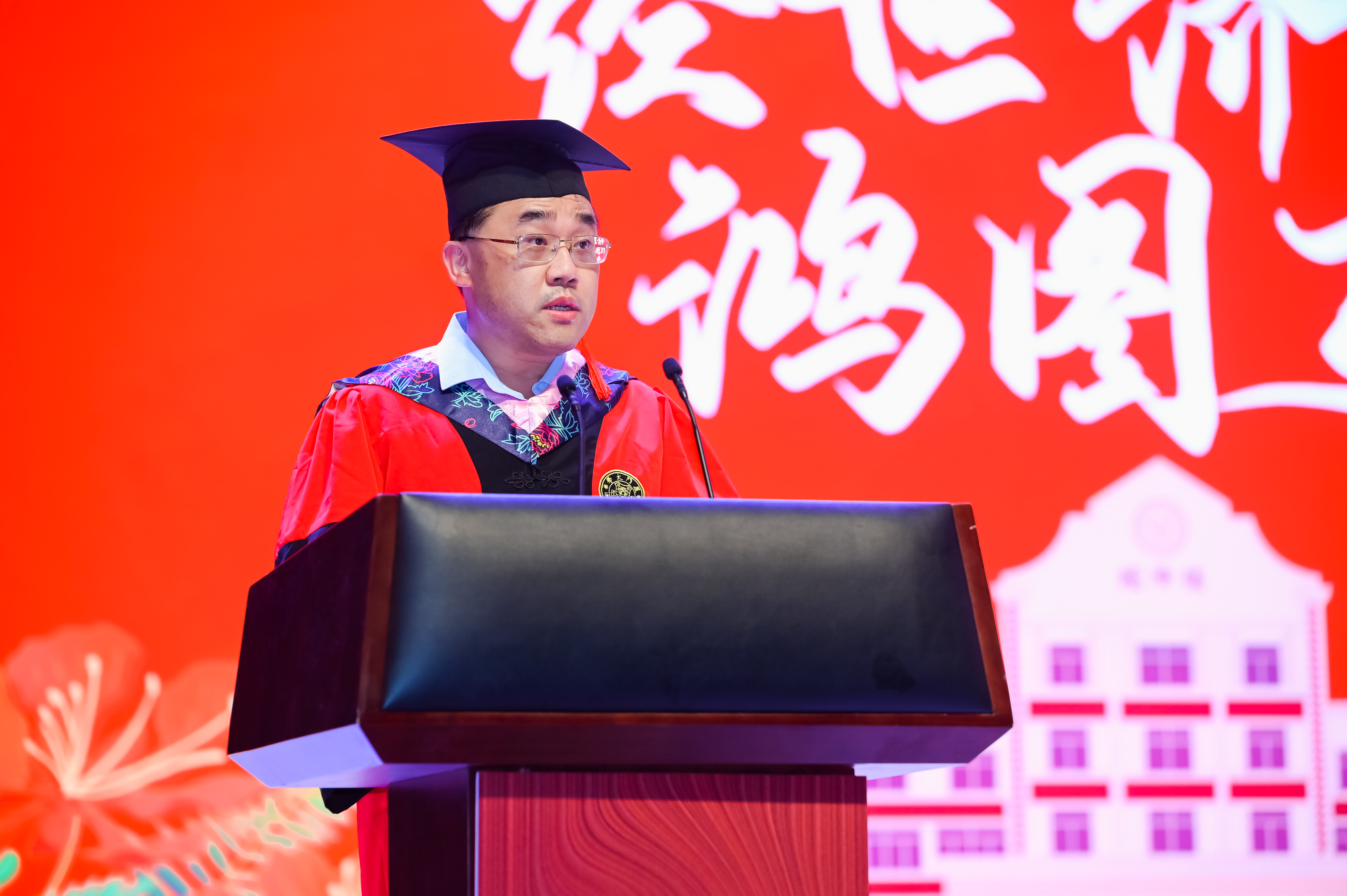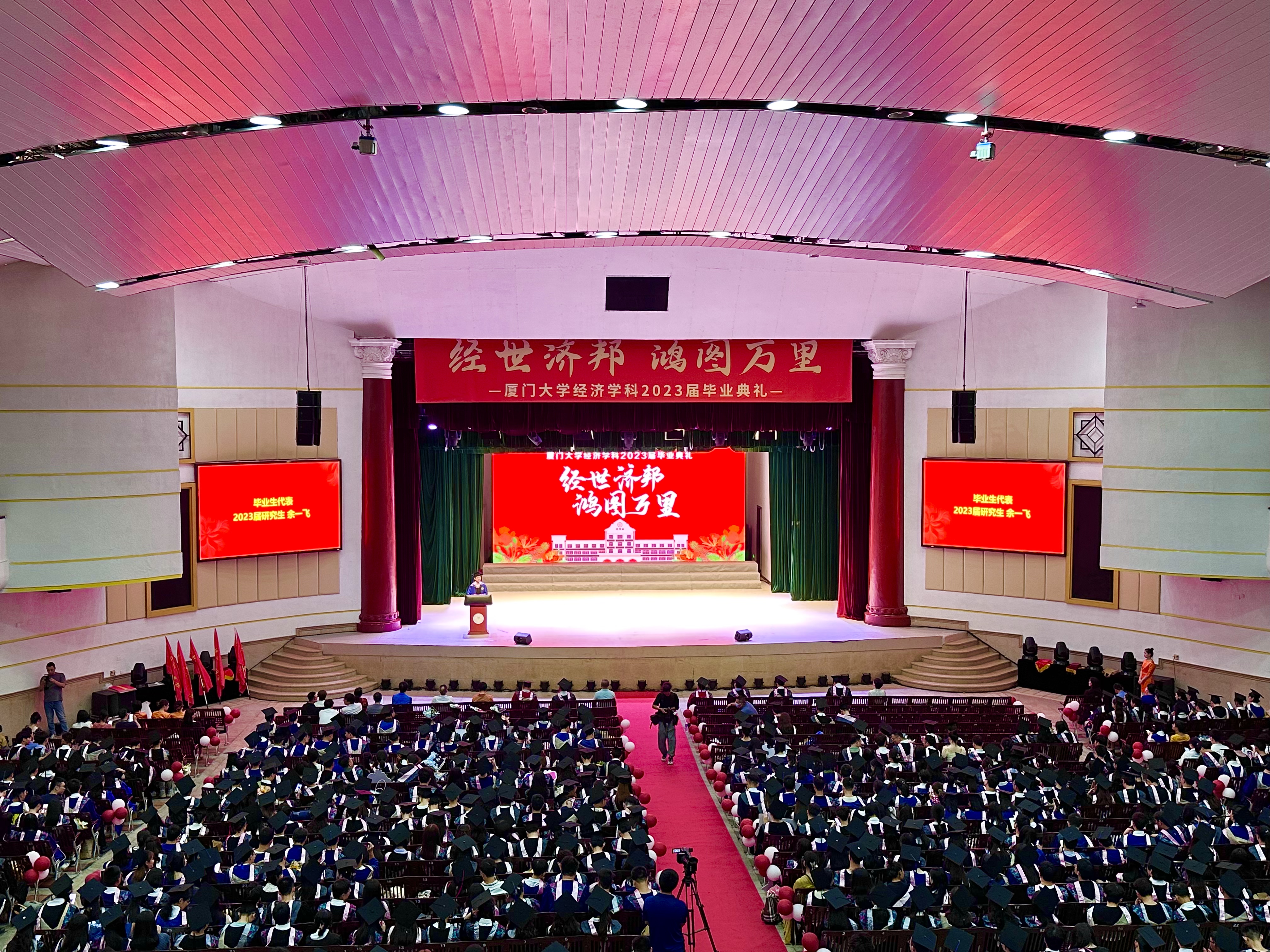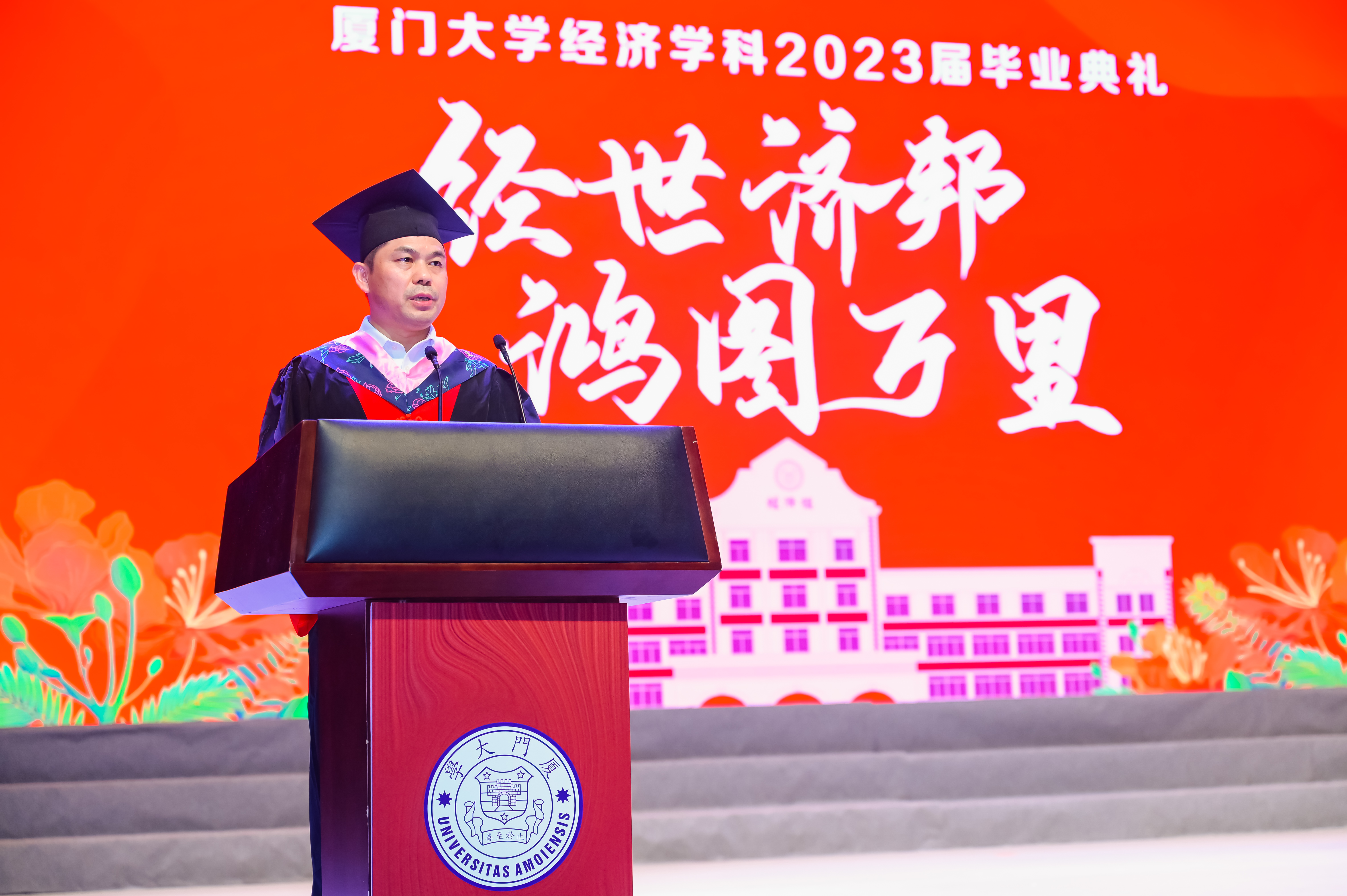 2023届本科生贺博钰、硕士生余一飞作为毕业生代表依次进行发言。他们回顾了自己的厦园时光以及在这几年里的成长和收获,表达了对学院领导、老师们无私奉献的敬意以及对学院、学校辛勤栽培的感谢,并提出了对未来的美好展望。他们动情地表示:“我们要主动承担起国家、民族和社会赋予的责任和使命,将梦想写进山河大海、写进蓝天草原,写在中华民族的这片土地上”“我们要肩负传递红色精神的使命,与时俱进,与党同心同行,为全面建设社会主义现代化国家、实现中华民族伟大复兴的中国梦作出新的更大贡献!”