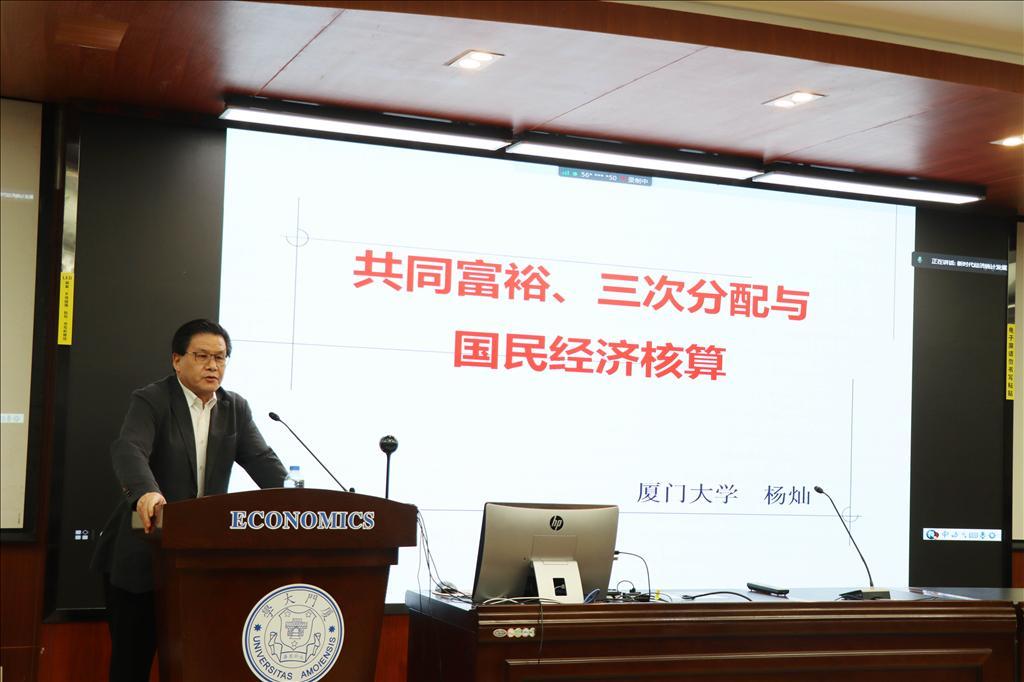 随后,主题演讲环节拉开帷幕。清华大学许宪春教授、江西财经大学邱东教授、太阳成集团tyc7111cc陈少华教授、国家统计局国民经济核算司陈杰副司长、中国人民大学高敏雪教授、太阳成集团tyc7111cc杨灿教授依次带来精彩演讲,主题包含数字经济增加值核算问题,2021年诺贝尔物理学奖对经济测度的启示,国民核算之外的经济统计,碳排放交易权核算,数字时代的经济增长与经济增长率测算,共同富裕、三次分配与国民经济核算等。