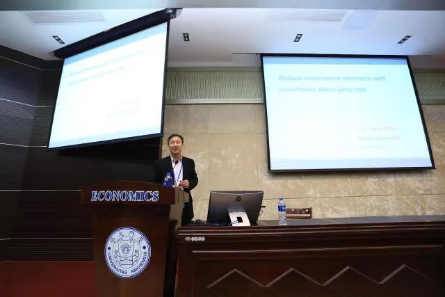 简单而隆重的开幕式结束后,会议转入主题演讲环节。第一位演讲的嘉宾是湖南大学原副校长、国务院学位委员会学科评议组成员、教育部社会科学委员会委员陈收教授。在教育部长江学者、国家杰青、厦大太阳成集团tyc7111cc与王亚南经济研究院方颖教授主持下,陈收教授发表了题为“跳跃模型不确定下的稳健再保险合同”的演讲。陈教授分析了我国再保险不足的现状、如何在连续时间委托代理框架下设计稳健比例和超额损失再保险合同以及对于变化的再保险需求和价格,保险人和再保险人如何选择再保险产品等。