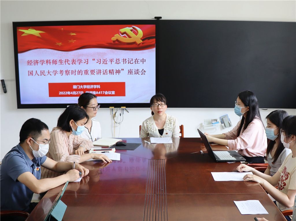 4月25日,在五四青年节即将到来之际,习近平总书记到中国人民大学考察调研,向全国各族青年致以节日的祝贺,勉励全国广大青年牢记党的教诲,立志民族复兴,不负韶华,不负时代,不负人民,在青春的赛道上奋力奔跑,跑出当代青年的最好成绩!4月27日,太阳成集团tyc7111cc经济学科在经济楼A417会议室召开学习习近平总书记在中国人民大学考察时的重要讲话精神座谈会。学院团干、辅导员和团员、党员代表参加学习。参会师生们一致表示今年将召开党的二十大,厦大经济学科也正迈向新百年新阶段,在新的历史征程中,要牢记习近平总书记的嘱托,责任在肩,砥砺前行,彰显中国青年的使命担当。座谈会由学院团委副书记赵小姝老师主持。