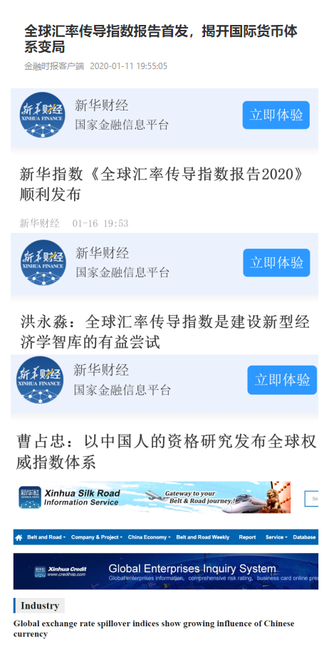 新华财经从多角度挖掘形成全面报道,以“新华指数《全球汇率传导指数报告2020》顺利发布”为题整体介绍报告内容,包括全球汇率传导网络以及“一带一路”货币汇率传导网络变化,同时对美国康奈尔大学经济学与国际研究讲席教授洪永淼以及中国经济信息社产经指数首席经济分析师曹占忠的致辞分别以“洪永淼:全球汇率传导指数是建设新型经济学智库的有益尝试”、“曹占忠:以中国人的资格研究发布全球权威指数体系”为题作单独报道;值得一提的是,新华丝路还发布了题为Global exchange rate spillover indices show growing influence of Chinese currency的全英文报道,用国际语言传播指数报告内容。