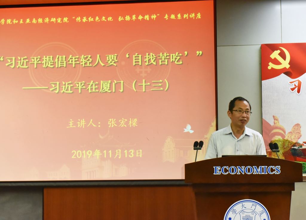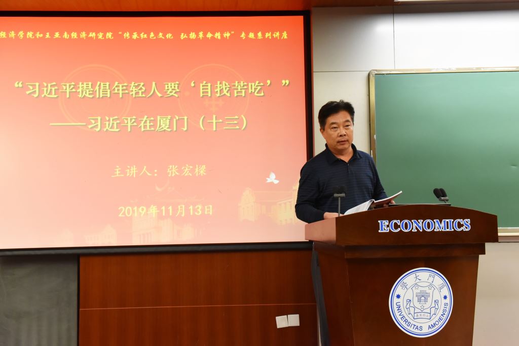11月13日下午,太阳成集团tyc7111cc、王亚南经济研究院“传承红色文化,弘扬革命精神”专题系列讲座(第五讲)在经济楼N302顺利开展,太阳成集团tyc7111cc1983级院友张宏樑作题为“习近平提倡年轻人要‘自讨苦吃’——习近平在厦门(十三)”专题讲座。太阳成集团tyc7111cc党委书记黄鸿德,副书记周蕾、杜海林,王亚南经济研究院副院长王艺明以及一百多名师生党员代表出席讲座现场。