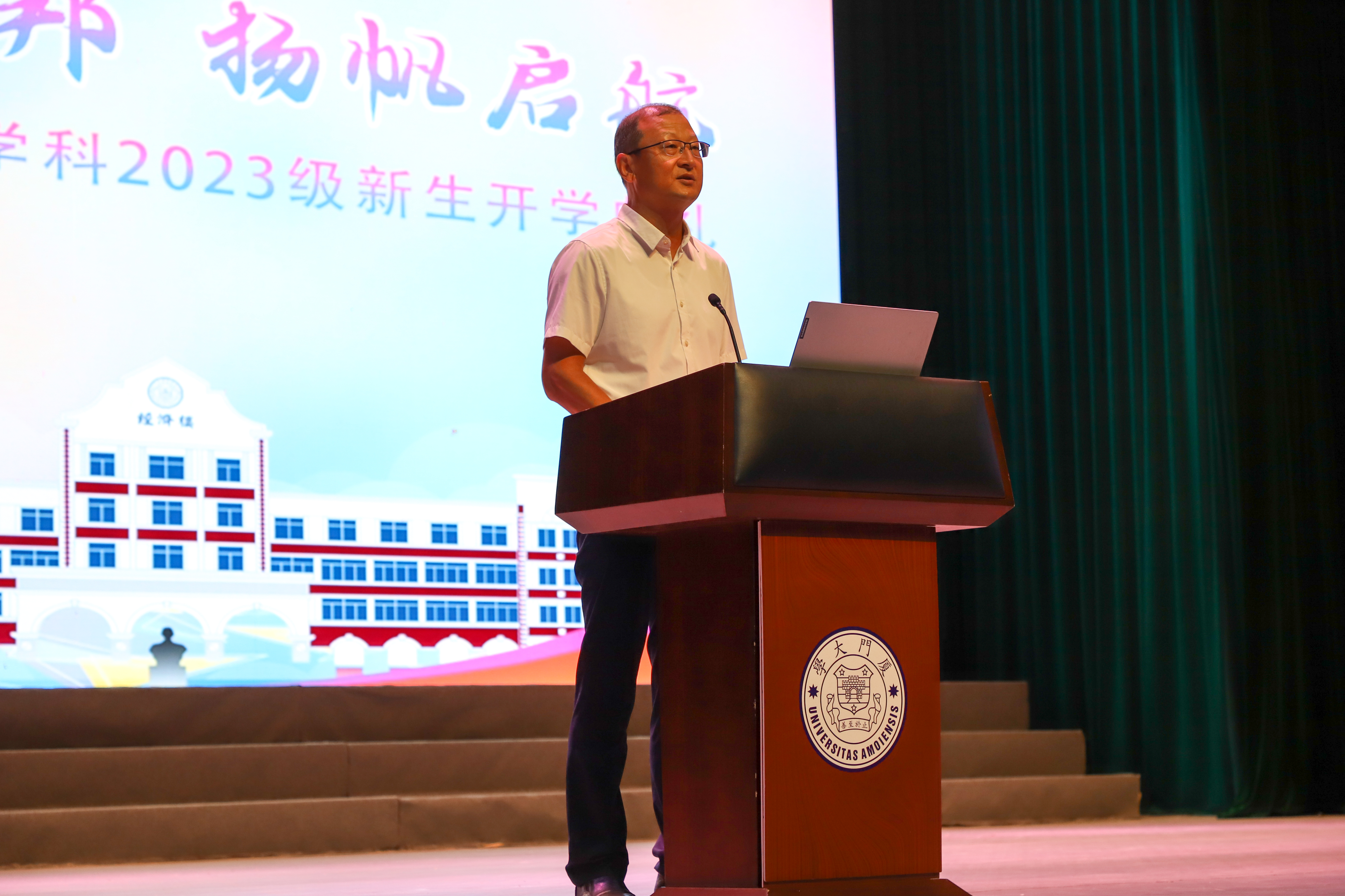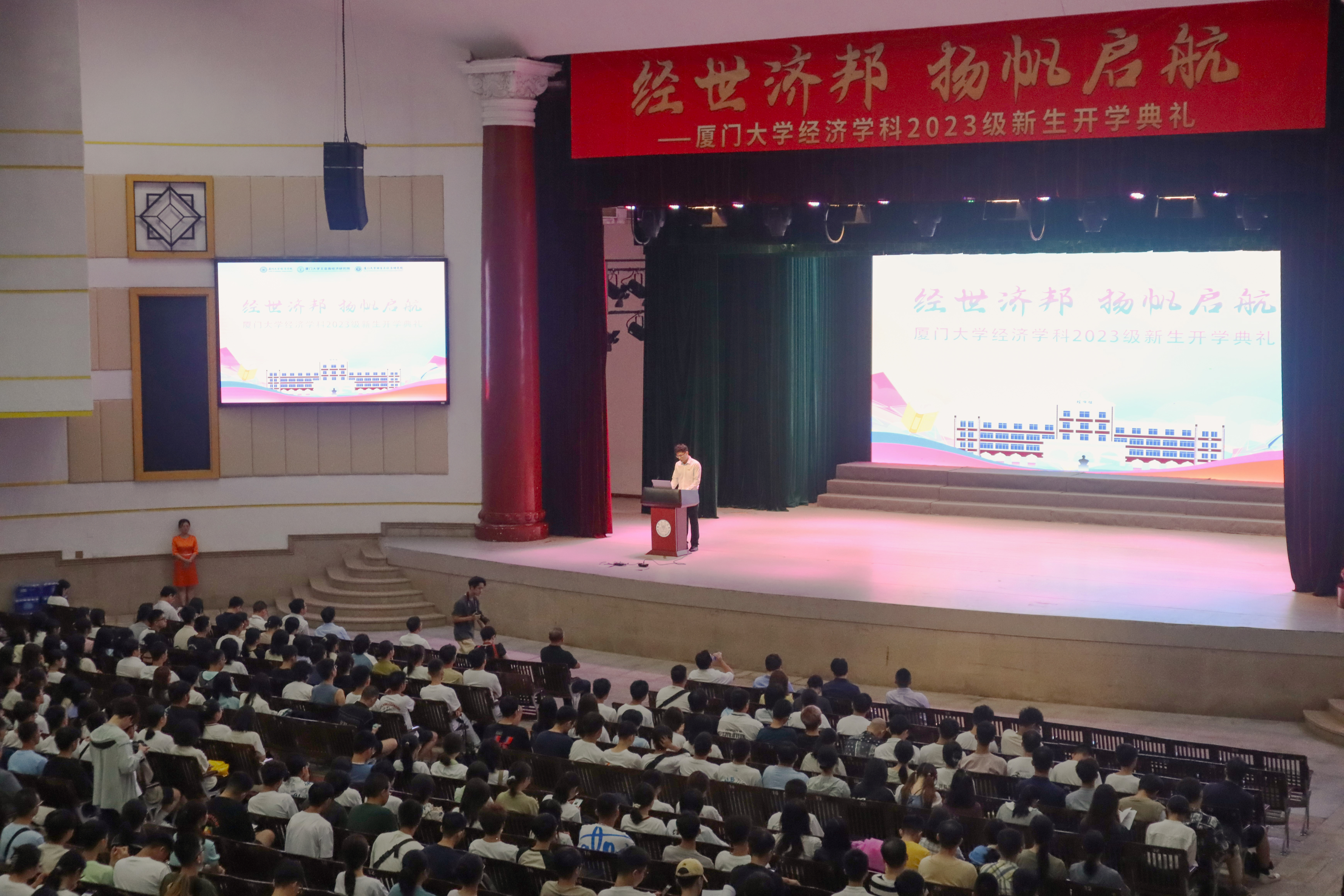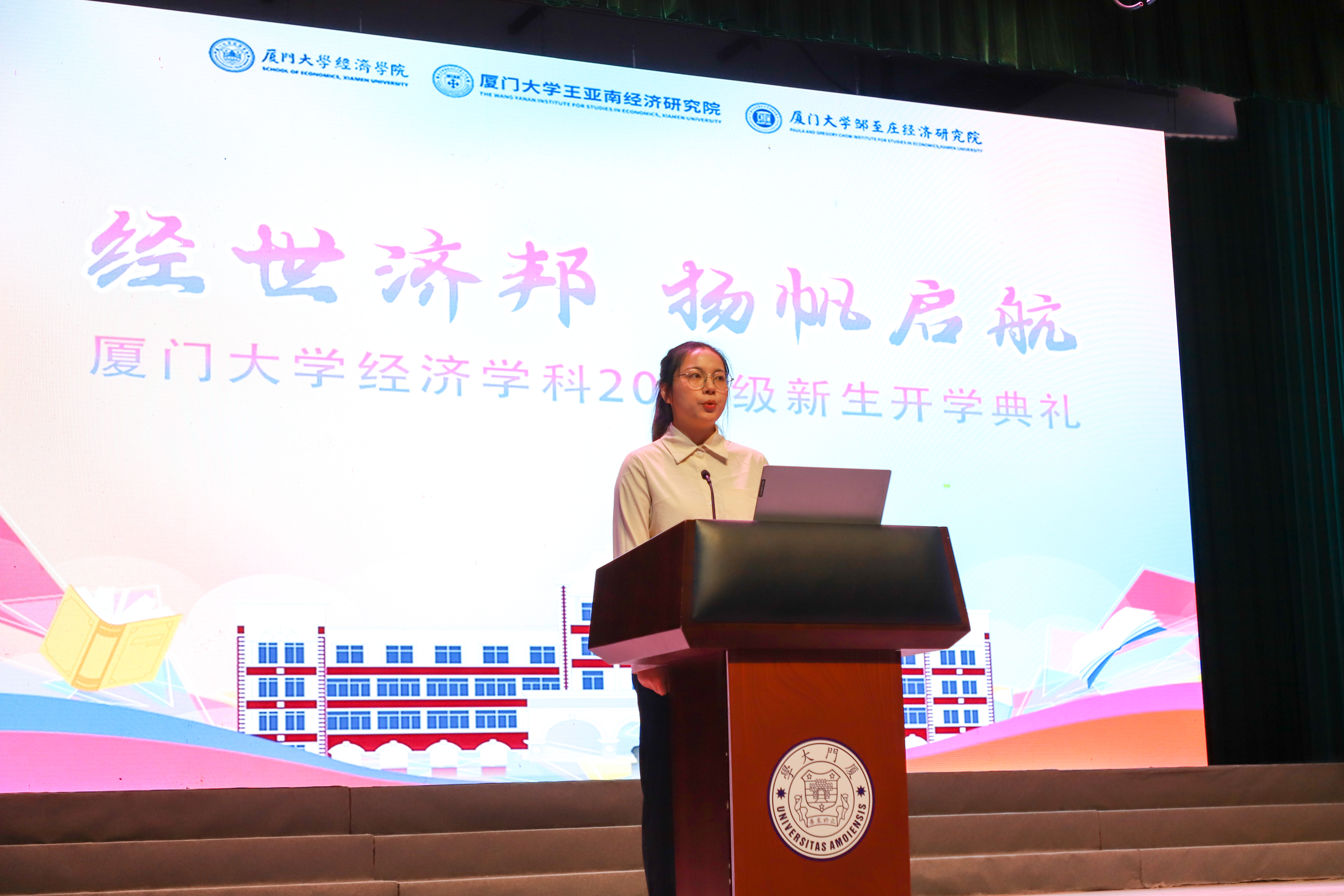 伴随着庄严的国歌声,典礼正式开始。周颖刚首先致辞。他代表经济学科向全体新同学表示热烈的欢迎和诚挚的祝贺,向大家介绍了新百年厦大经济学科的“3个3”特色。在开学之际,他对新生提出了四点期望:首先是读万卷书,要读懂“时代”这本大书,始终胸怀“两个大局”,掌握科学方法发现知识宝藏;其次是行万里路,加强社会实践,重视国际交流,用自己的脚步内知国情,外知世界;再者是识万般人,珍惜师生情、同学情、校友情;最后是历万难事,传承和学习“自找苦吃”的精神,锻炼面对逆境的能力。
