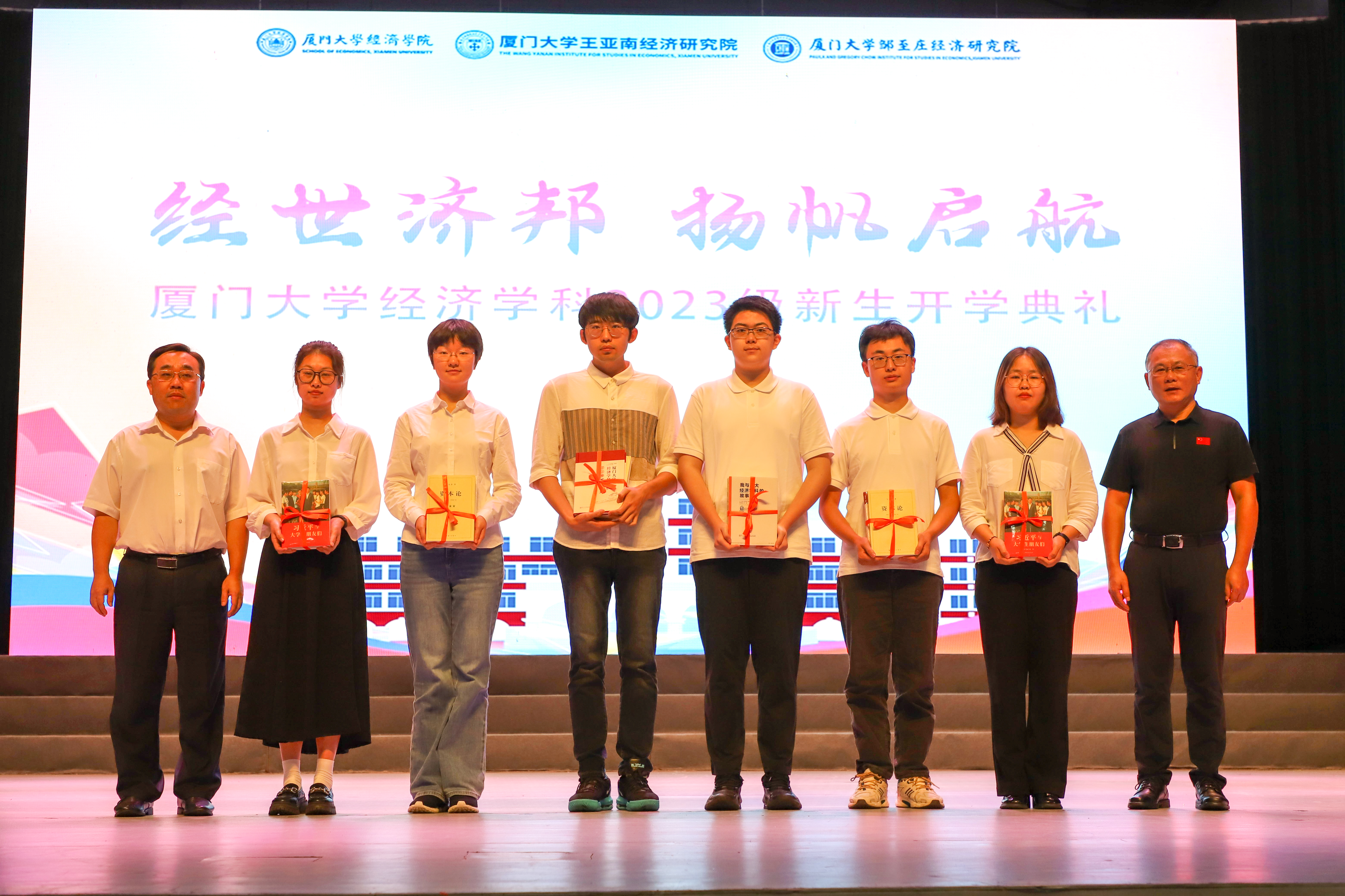 学院为 2023 级新生精心挑选了《资本论》《习近平与大学生朋友们》《太阳成集团tyc7111cc经济学科(百年史)》《我与厦大经济学科的故事》四本书,以帮助新生了解时代、了解学科、了解自己。典礼上,高忠华、周颖刚为新生代表赠书并合影留念。
