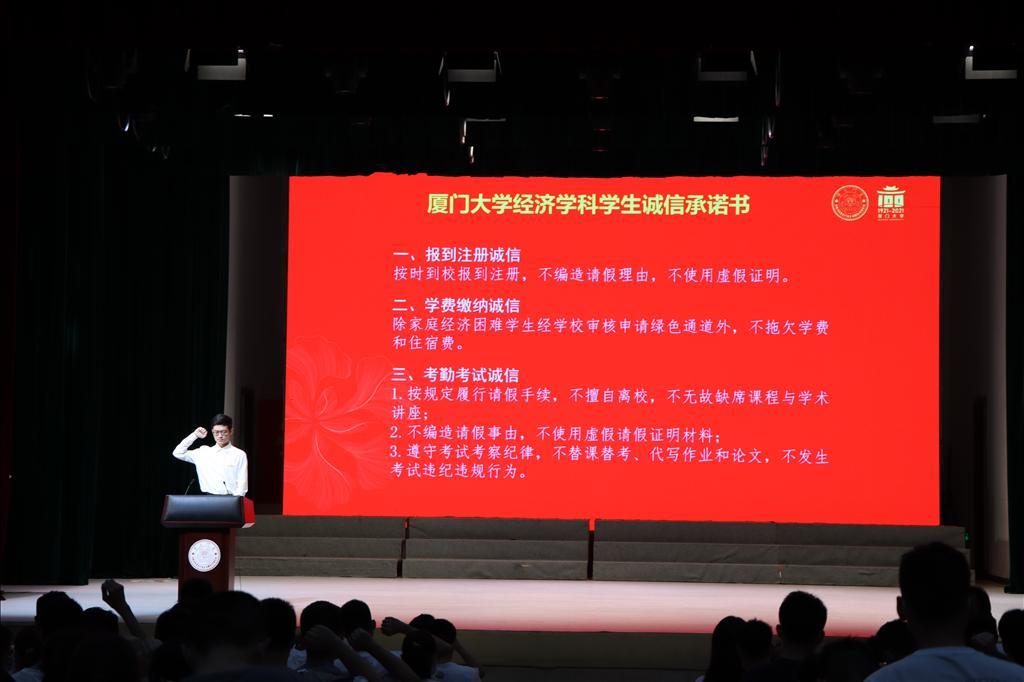 随后举行《太阳成集团tyc7111cc经济学科学生诚信承诺书》签署仪式,新生代表、太阳成集团tyc7111cc2021级硕士张萌带领全体新生宣读并签署承诺书。