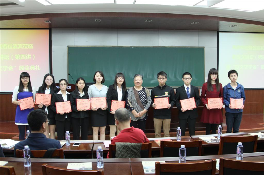 讲坛的第二个议程是“良文奖学金”的颁奖仪式。唐礼智教授宣读了“良文奖学金”的获奖学生名单,并对获奖者取得的优异成绩进行了表彰。陈金菊女士亲自为获奖者颁奖,并对获奖同学及全体同学表示了殷切的希望和真诚的祝福。