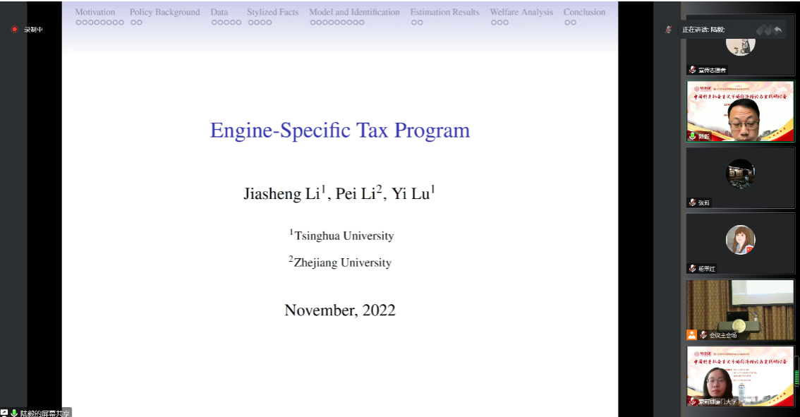 清华大学陆毅教授带来题为“Engine-Specific Tax Program”的报告,探究了发展中国家为控制汽车碳排放而广泛使用的“Engine-Specific Tax Program”的有效性。此研究利用2015年针对小型排量汽车开展的减税政策,发现小型和大型排量汽车对此政策具有显著的价格和销售反应,结果表明整个市场存在较强的竞争溢出效应。报告中,陆毅教授首先介绍了如何选用和构建量化模型,并利用量化模型合理地估计税收政策对不同排量汽车销量的影响。