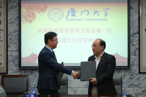 12月20日,厦大经济学科与银联商务战略合作协议续签仪式在经济楼N501举行。银联商务副总裁张靖文、业务管理部总经理兼大数据项目组兼天天富项目组总经理于震,银联商务厦门分公司总经理方一兴、业务管理部助理总经理兼大数据项目组副总经理钱佳、大数据业务项目组产品总监徐伟男,以及厦大经济学科周颖刚、许文彬、陈海强、钟威、钟锃光等老师参加了仪式。