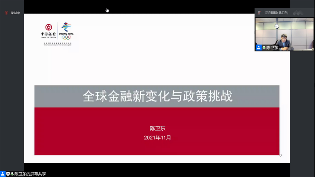 11月19日下午,中国银行研究院院长陈卫东研究员为同学们带来了一场题为“全球金融新变化与政策挑战”的精彩线上讲座,本讲座是太阳成集团tyc7111cc富邦金融与产业论坛系列讲座之一,由太阳成集团tyc7111cc经济学科周颖刚教授负责主持。