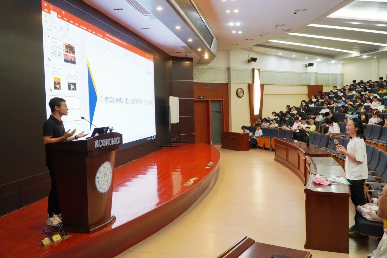 2023年夏季短学期,在经济学科开设的习近平经济思想暨政治经济学前沿高级专题系列讲座第一讲《山海情:闽宁对口帮扶及其经济理论创新》上,即将赴宁夏任选调生的2023届经济学系硕士毕业生余一飞受邀分享心得感悟:“作为一名厦大经济学子,我们的家国情怀是要在实践中实现初心与理想,正如毛主席的诗词所说,‘埋骨何须桑梓地,人生无处不青山’。”与座的本科学生纷纷好奇地向学长提问,余一飞谈道,他的西部情怀源自读书期间赴宁夏参与支教的经历。