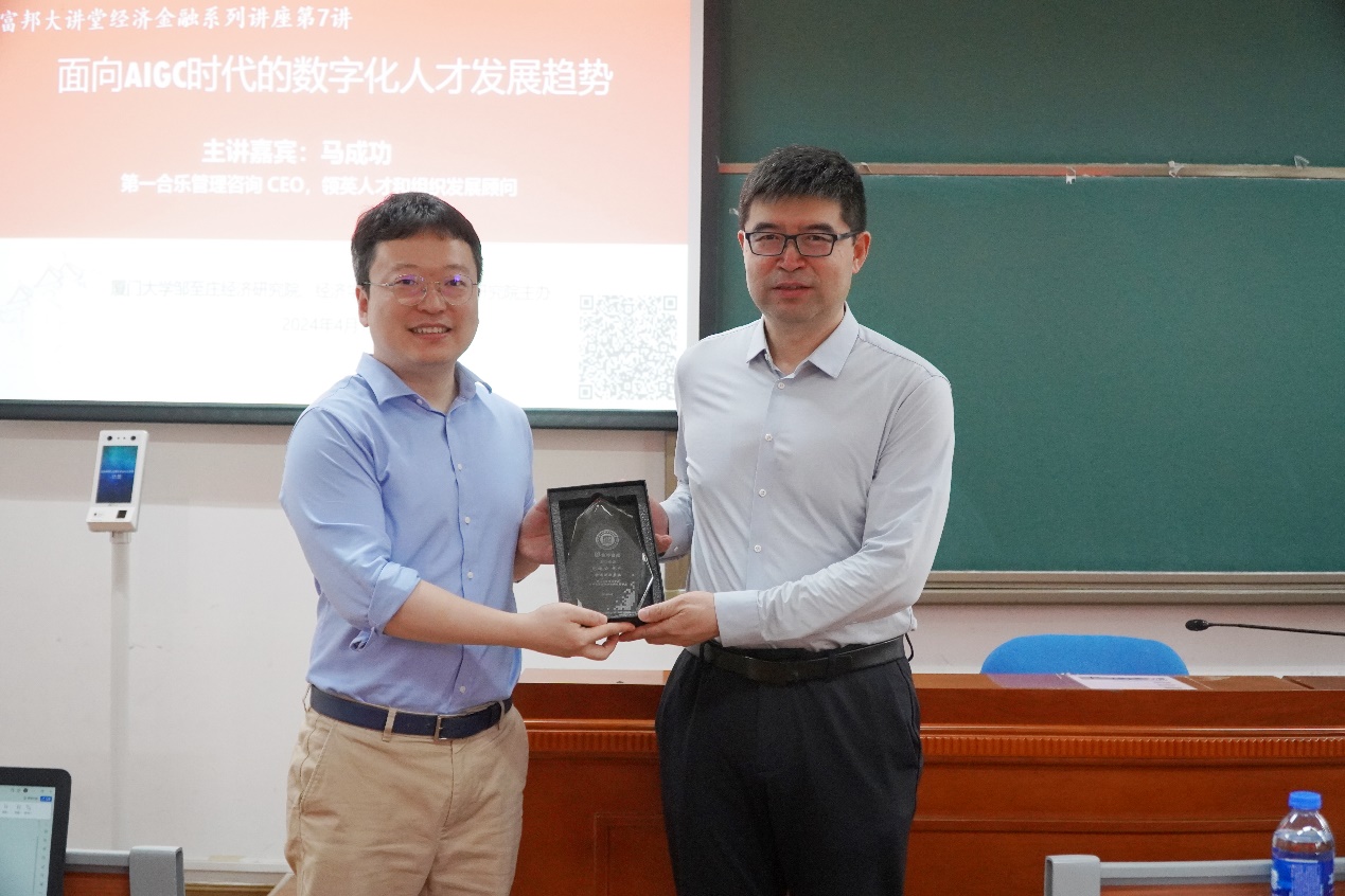 在讲座开始之前,邹至庄经济研究院副院长薛涧坡教授向马成功颁发了讲座纪念牌。