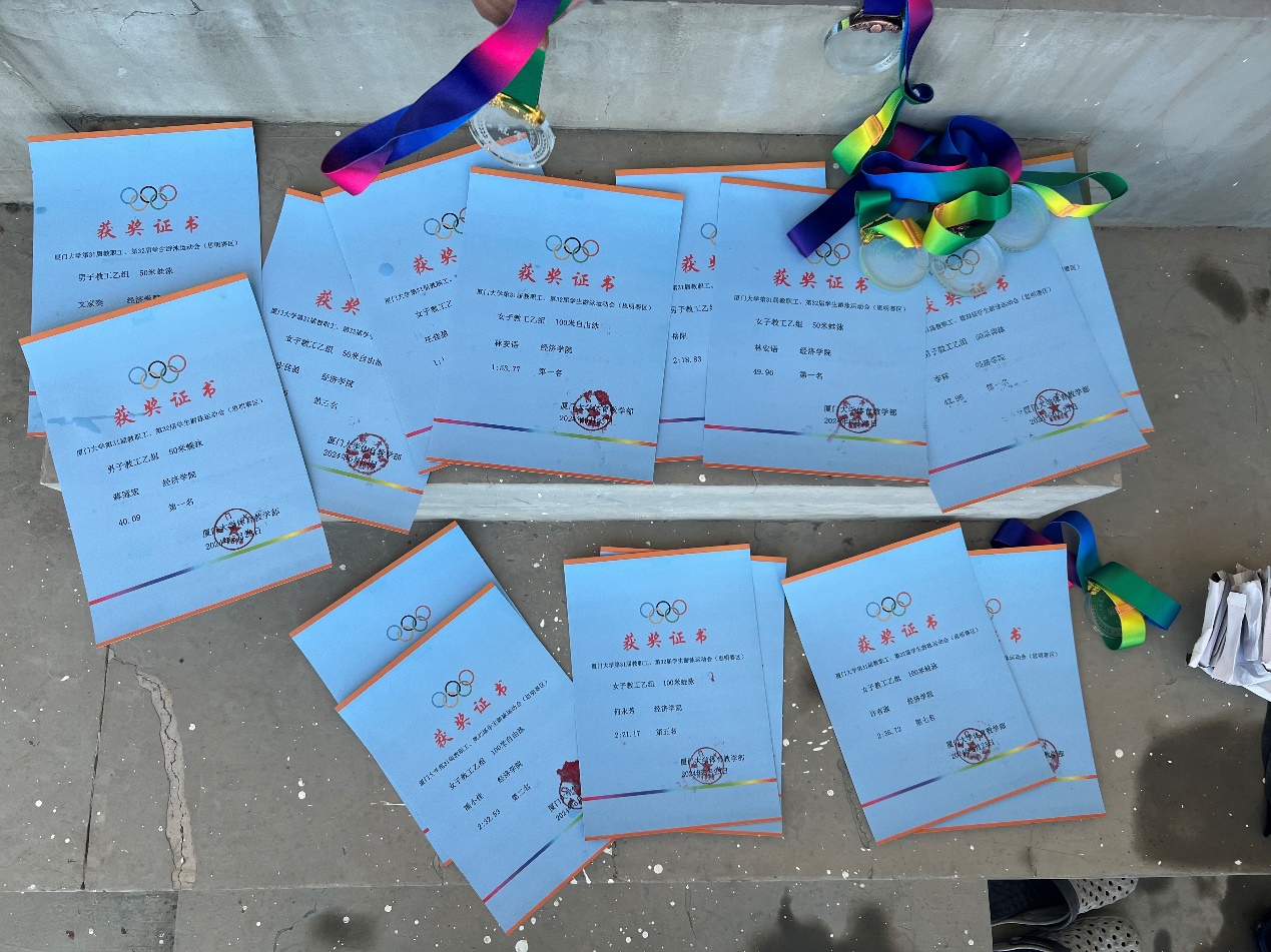 代表经济学科出战本次教工游泳运动会的队员共9人,包括林安语,何永芳,庄佳盈,潘小佳,岳阳,文家奕,蒋冠宏,李祥,许有淑,共获得了个人项目4个冠军、2个亚军、2个季军,同时还获得了最重量级的4╳50自由泳接力赛的团体冠军。其中,林安语获得接力冠军、50米蛙泳和100米自由泳冠军的好成绩,李祥获得2项冠军,并打破了学校50米仰泳的记录;蒋冠宏获得50米蝶泳冠军和接力赛的冠军,潘小佳获得100自由泳的亚军,庄佳盈获得50自由泳的季军,岳阳获得100仰泳的季军,其余参赛教工也都分别在个人及团体接力赛中斩获不俗成绩。在王璐航和钟威老师因伤缺阵的情况下,大家齐心合力,发扬我院积极进取,顽强拼搏的精神,取得了团体的第二的成绩属实不易。