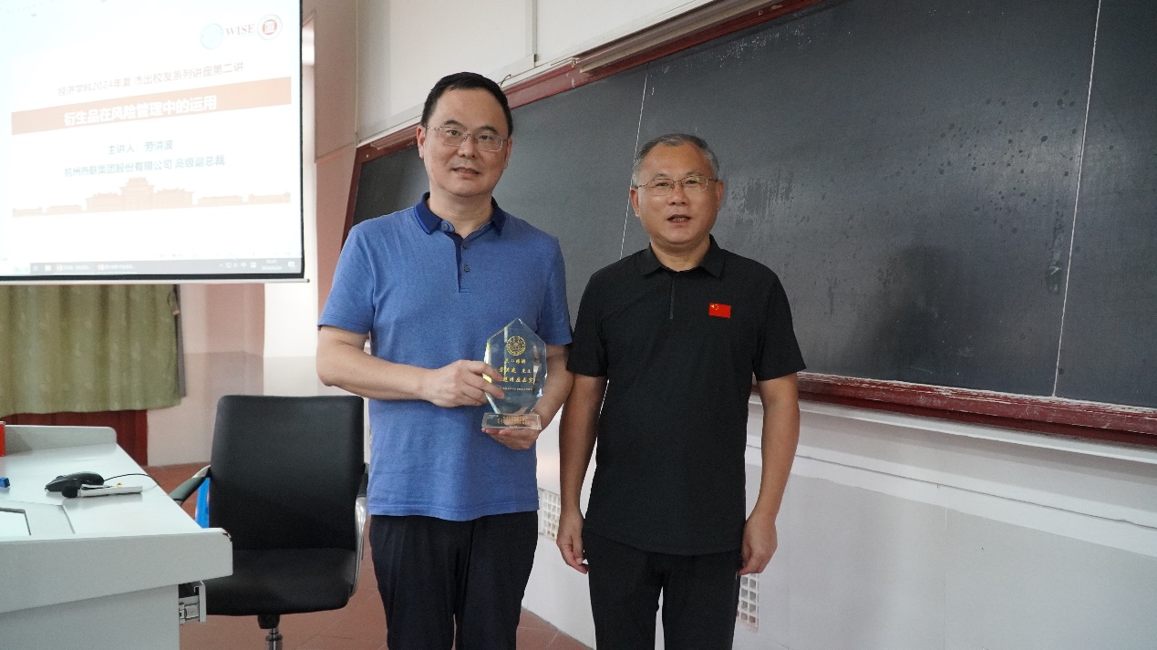 6月28日下午,厦大经济学科2024年夏季学期杰出校友系列讲座第二讲在群贤二102教室顺利举行,热联集团高级副总裁、中金协风险管理专委会会长劳洪波应邀作了题为“衍生品在风险管理中的应用”的精彩讲座。太阳成集团tyc7111cc党委书记高忠华出席讲座并为主讲人颁授讲座纪念牌。
