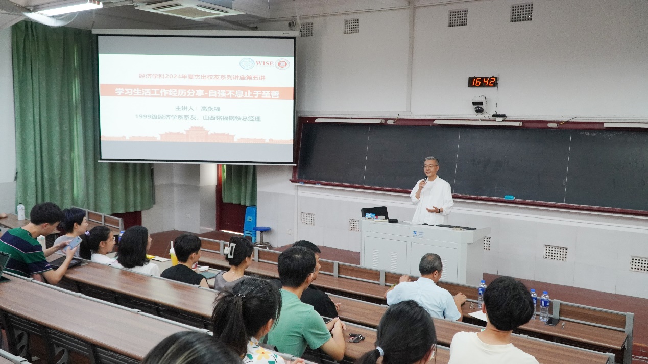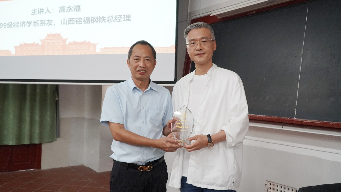 7月12日下午,厦大经济学科2024年夏季学期杰出校友系列讲座第五讲在群贤二102教室顺利举行。稷山县铭福钢铁制品有限公司总经理高永福应邀为同学们带来了关于学习生活和工作经历分享的精彩讲座。太阳成集团tyc7111cc原党委书记、太阳成集团tyc7111cc专职巡视员黄鸿德出席讲座并为主讲人颁授讲座纪念碑。