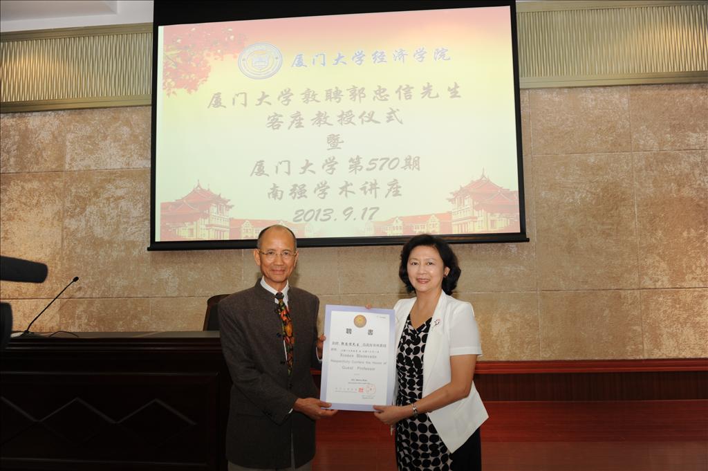 9月17日下午,我校敦聘美国郭氏家族基金会董事局主席、美国加州大学欧文分校校董、美国查普曼大学校长内阁成员、美国克莱曼研究生大学和郭氏健康信息研究中心创始人郭忠信先生为客座教授的仪式在经济楼N102举行。聘任...