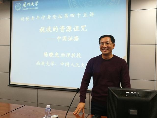 12月13日, “财税青年学者论坛第四十五期”学术讲座在经济楼A501顺利举行。西澳大学商学院、兼职于中国人民大学中国财政金融政策研究中心的陈晓光助理教授应邀带来题为“税收的资源诅咒——中国证据(Taxational Re...