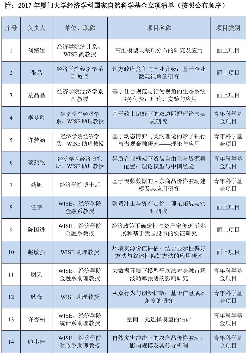 8月17日,国家自然科学基金委员会公布了2017年度国家自然科学基金申请项目评审结果。厦大经济学科延续2011年以来的强势表现,共有14项课题获得基金资助项目立项,其中:面上项目6项,青年科学基金项目8项,获资助直接...