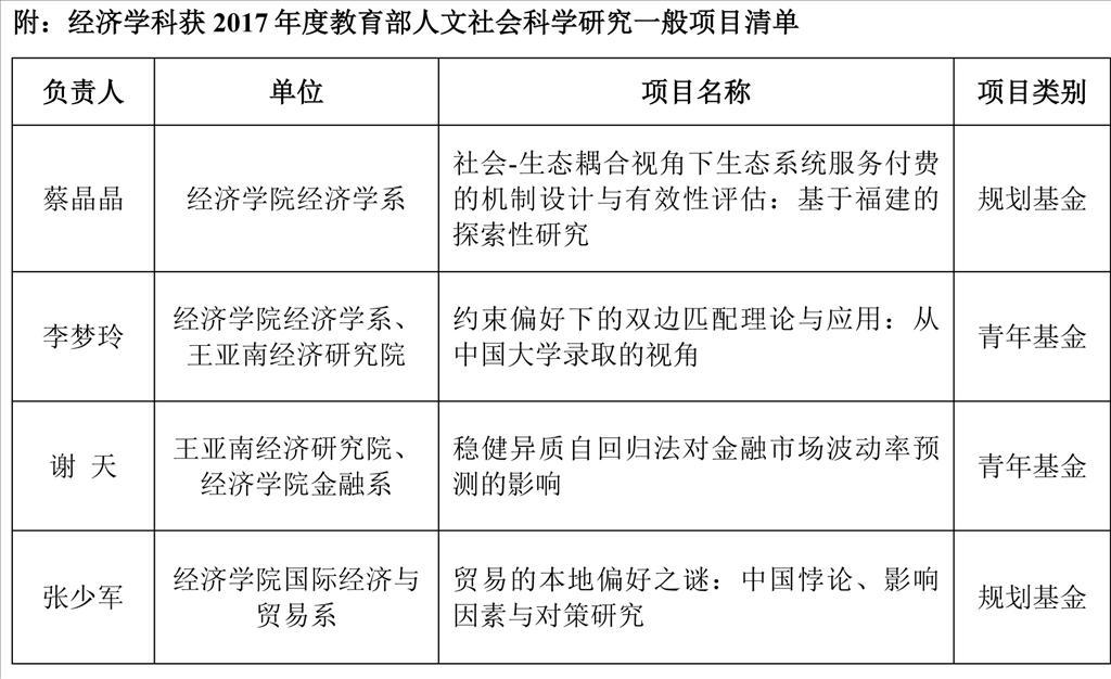 近日,教育部社科司公布了2017年度教育部人文社会科学研究一般项目立项结果。此次厦大经济学科共有4项课题喜获立项,其中:蔡晶晶、张少军2位老师获规划基金项目资助,李梦玲、谢天2位老师获青年基金项目资助。 &nbs...