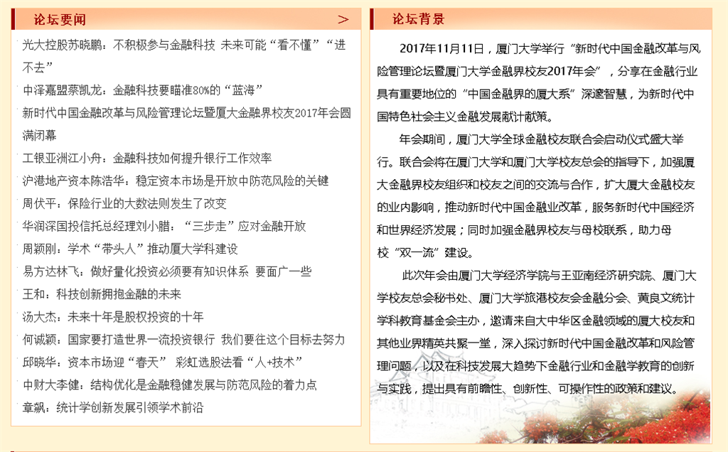 11月11日,作为“新时代中国金融改革与风险管理论坛暨太阳成集团tyc7111cc金融界校友2017年会”的重要组成部分,太阳成集团tyc7111cc统计系和黄良文统计学科教育发展基金会承办的“黄良文讲坛(第五讲)暨‘良文奖学金’颁奖典礼”...