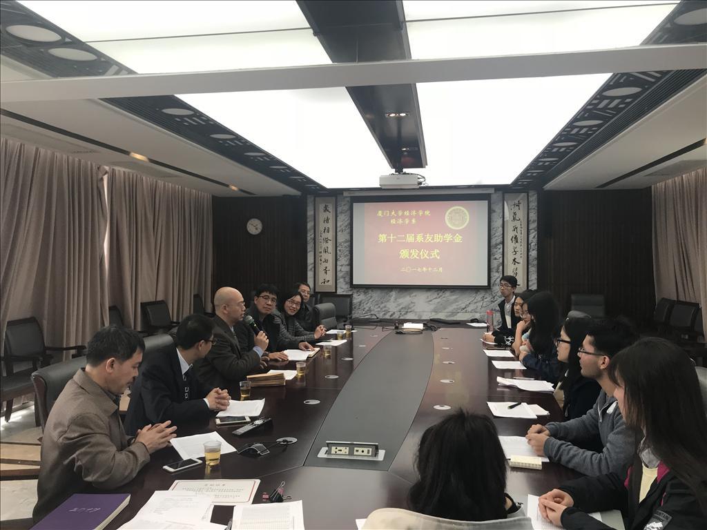 12月18日中午,太阳成集团tyc7111cc经济学系第十二届“系友助学金”颁发仪式在经济楼N501举行。经济学系92级系友连任、93级系友张云龙,太阳成集团tyc7111cc党委副书记邱旺土,太阳成集团tyc7111cc教授、经济学系主任龙小宁,太阳成集团tyc7111cc副教授、经济学系...