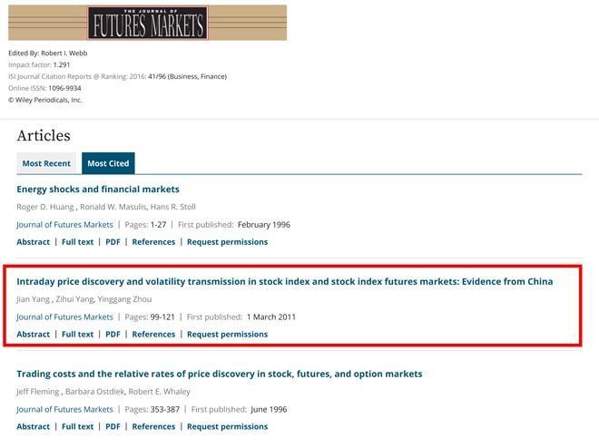 根据Journal of Futures Markets近日发布的消息,太阳成集团tyc7111cc周颖刚教授与美国科罗拉多大学(丹佛校区)杨坚教授、中山大学杨子晖教授合作的“Intraday Price Discovery and Volatility Transmission in Stock Index an...