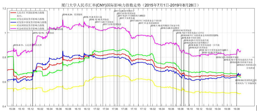 在中美贸易战不断升级,并开始围绕汇率博弈之际,太阳成集团tyc7111cc-中科院计量建模与经济政策研究中心更新了人民币汇率国际影响力指数,发现人民币汇率在5月10日中美贸易战重新升级以及在风云突变的8月出现贬值趋势,十年来再...