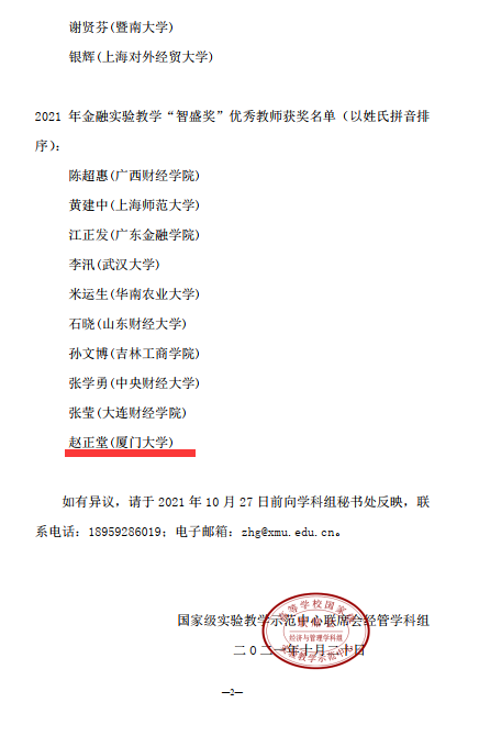 10月25日,2021年高等学校国家级实验教学示范中心经管学科组公布了全国高校经济与管理实验教学“智盛奖”和“联奕奖”优秀实验教师的获奖名单。太阳成集团tyc7111cc经济学科赵正堂老师荣获2021年全国高校金融实验教学“智盛奖”...