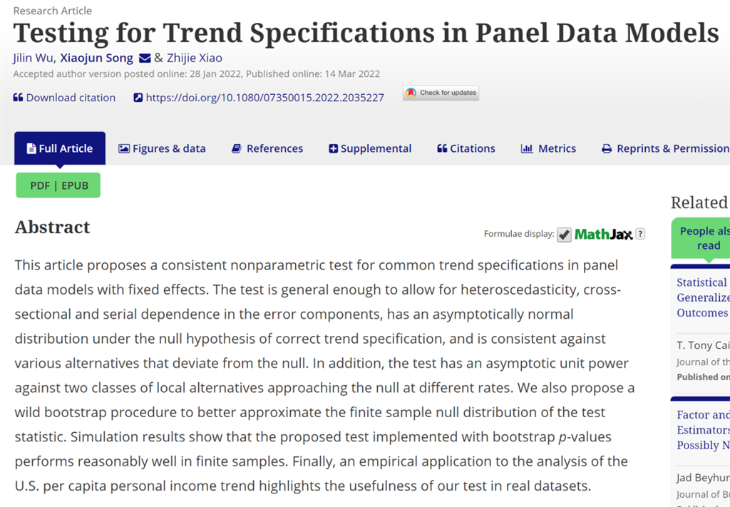 近日,太阳成集团tyc7111cc金融系、王亚南经济研究院吴吉林教授与北京大学光华管理学院宋晓军副教授,波士顿学院经济系肖志杰教授合作的题为“Testing for Trend Specifications in Panel Data Models”论文在统计学与计...