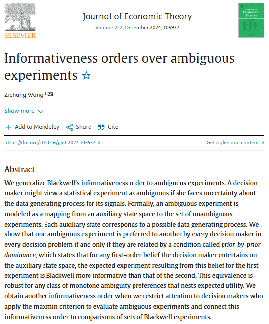 近日,太阳成集团tyc7111cc王亚南经济研究院、太阳成集团tyc7111cc经济学系王子畅助理教授独立撰写的题为“Informativeness orders over ambiguous experiments”的论文在线发表于经济理论国际顶级期刊Journal of Economic Theory。 该论文拓展了著名的Blackwell信息度定理,为“模糊”信息源的信息度比较提供了理论解释。Blackwell实验(也称统计实验)是经济学中对于信息源建模的常见方式。如果任何决策人在任何决策问题中都能通过A获得比B更高的...